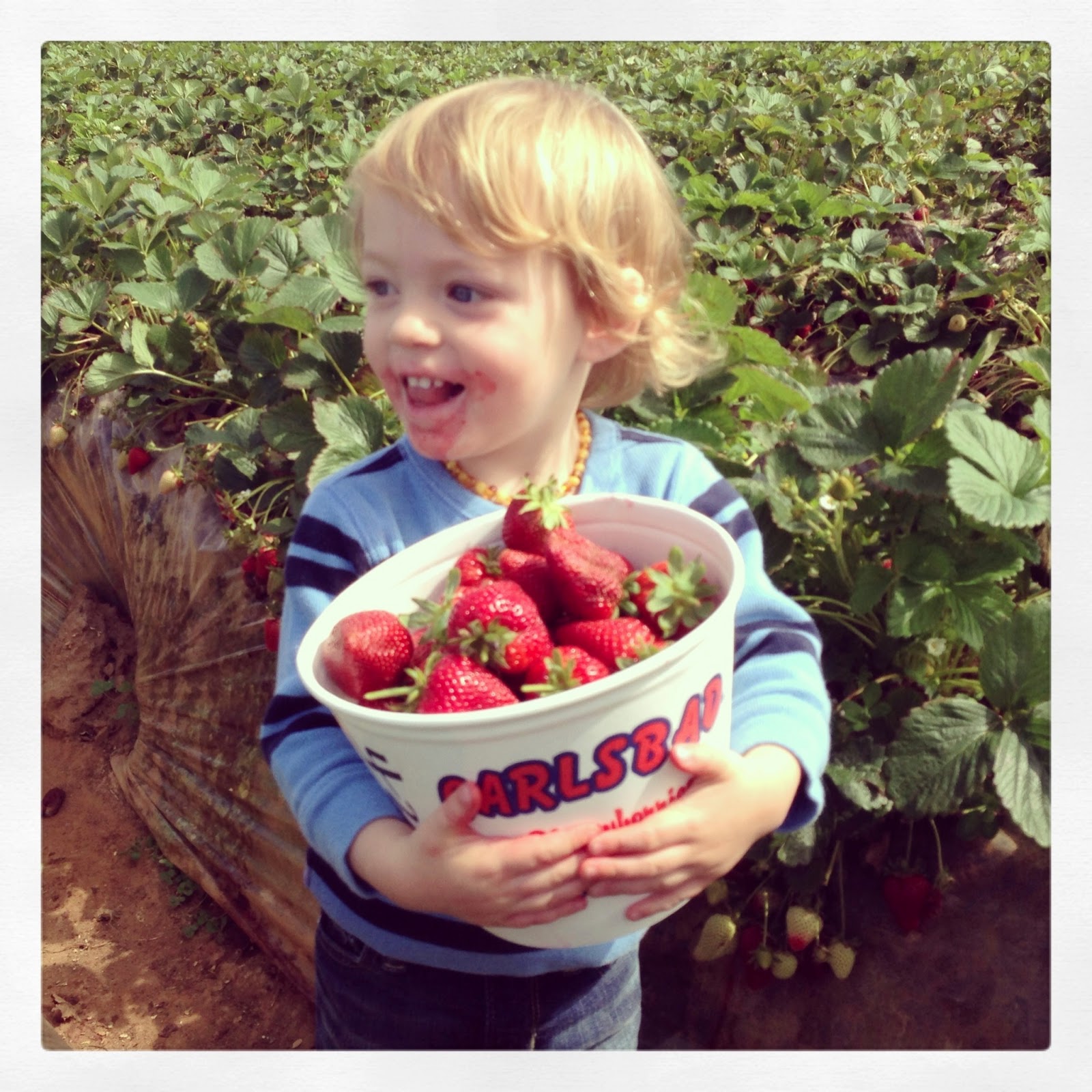Growing up in San Diego, I've driven by the U-Pick Strawberry Farm in Carlsbad literally hundreds of times in my life.  It's right there off the freeway on your way to or from San Diego.  I always thought it would be fun to go, but never had that push I needed to actually do it.  Last year my friend's blog post on it made me really want to go, but being busy a busy family with one day together a week, it passed us by.  This year my friend blogged about it again and I wrote it on the calendar on our next free Monday.  I knew Becker was at an age where this would be something we would all really enjoy.  Heading into our second trimester with our newbie on the way I am actually feeling fairly decent as well which is a bonus after the past 12 weeks.  I wanted to check out the Carlsbad Flowers too as they look amazing, but alas one thing at a time.  We barely made it home for Becker's nap as it was.  When Becker does manage to fall asleep in the car it is often 10 minutes before we get home which leads to a wide awake little boy as soon as we park the car.  Anyway, onto our super fun morning.